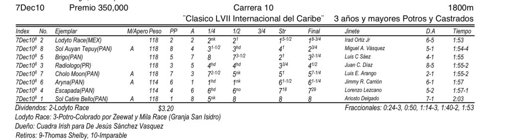 ‘Lodyto Race’ logró su victoria N°10 en trece presentaciones, para los colores de la Cuadra Irish, entrenada por De Jesús Sánchez Vásquez, criada en la Granja San Isidro, siendo hija del padrillo ‘Zeewat’, en la yegua madre, ‘Mila Race’, por el abuelo materno, ‘Danzing Prone Race’.