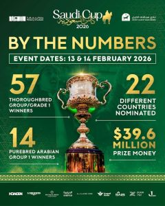 El encuentro de dos días, que comienza el 13 de febrero, ha atraído a 57 ganadores individuales de Grupo o Grado 1 en su totalidad y a 14 ganadores de Grupo 1 de pura sangre árabe. Las nominaciones, repartidas entre 22 países diferentes, competirán por un premio total de casi 40 millones de dólares.