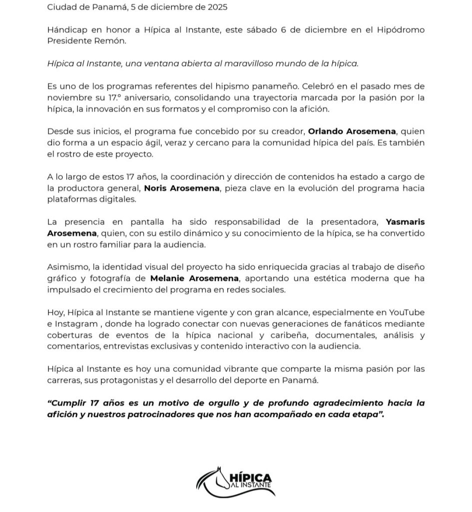 InternacionalPanamá “Hípica al Instante” celebra 17 años de historia y evolución en la hípica panameña diciembre 5, 2025 Nota de Prensa