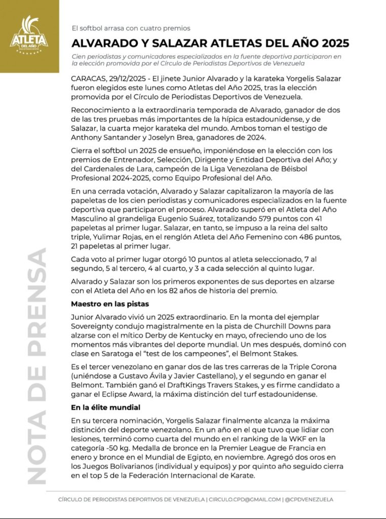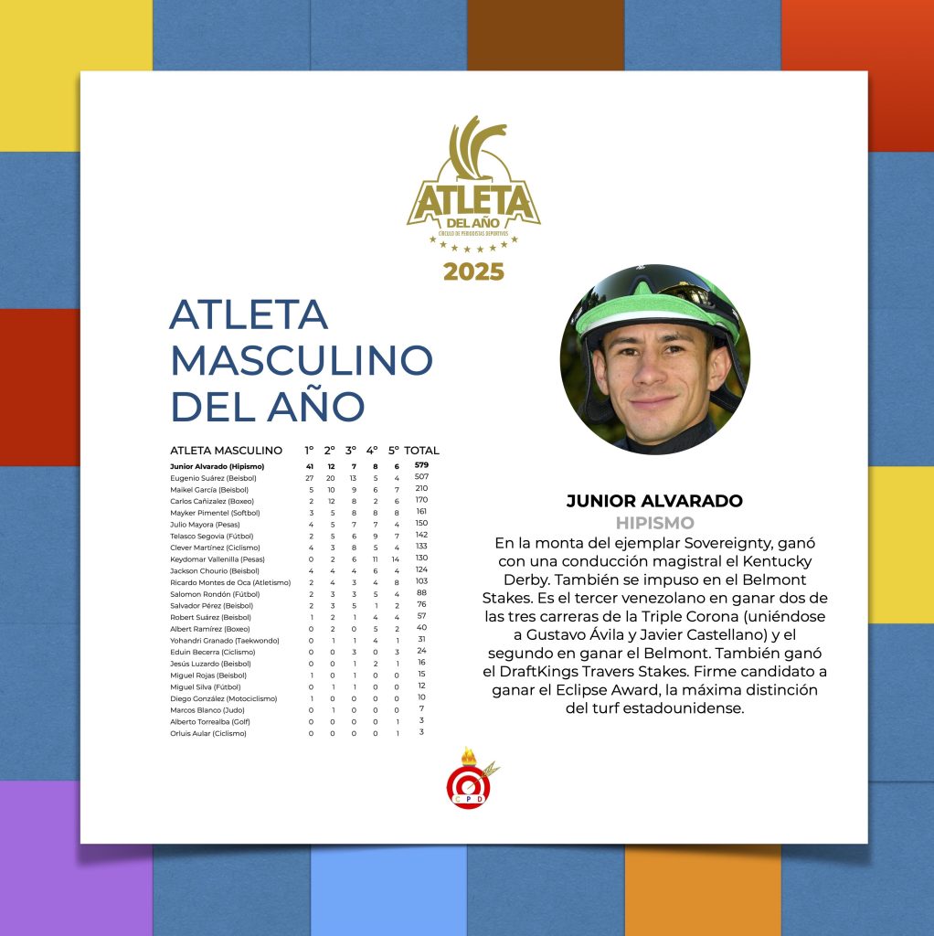 El Círculo de Periodistas Deportivos de Venezuela anunció que Junior Alvarado se convierte en el primer jinete en 83 años de historia del Atleta del Año, que logra tal distinción. No debemos olvidar a grandes atletas como Juan Vicente Tovar, Angel Francisco Parra y un largo etcétera que también merecieron en su momento tal reconocimiento.