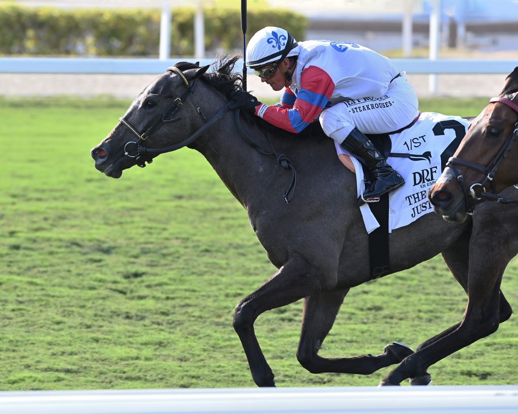 HALLANDALE BEACH.- Just Basking, de Andrew Schwarz y Wendy Schwarz Gilder, remató desde el último lugar hasta el primero para ganar el The Very One Handicap (G3) de $175,000, una carrera de césped de 2200 metros para cuatroañeras y mayores.