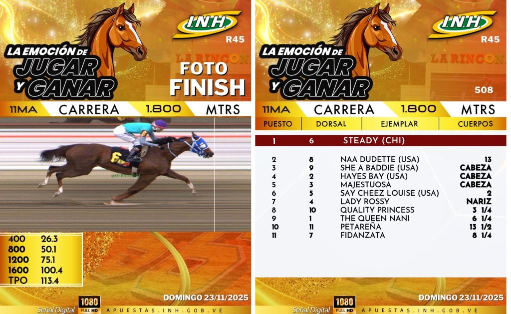 Tras agenciar 75″1 y 100″4, la conducida por Francisco Quevedo, lograba su segunda victoria en Venezuela (Primera selectiva) con 13 cuerpos de ventaja sobre las norteamericanas NAA DUDETTE, SHE A BADDIE y HAYES BAY con MAJESTUOSA cerrando el marcador en lote de once participantes.