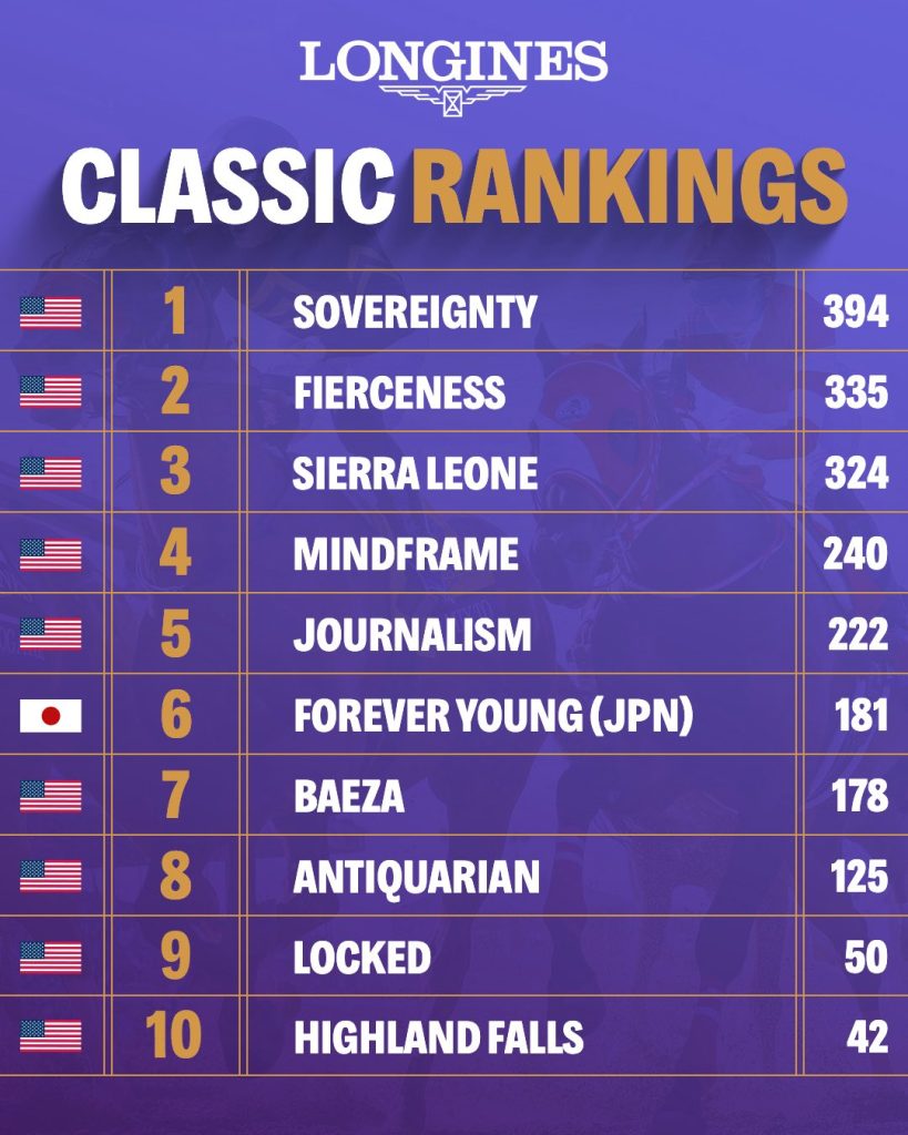 LEXINGTON, Kentucky (30 de septiembre de 2025) ― Locked, de Eclipse Thoroughbred Partners y Walmac Farm, ganador del Woodward Stakes (G2) del sábado en el hipódromo de Aqueduct, se ha unido al top 10 de la clasificación Longines Breeders’ Cup Classic, mientras que Sovereignty sigue siendo el líder general.