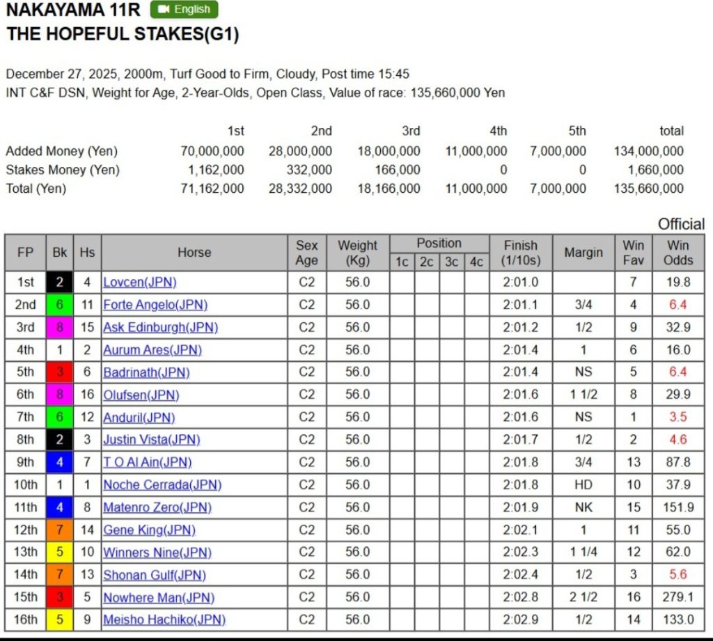 En una jornada fría de finales de diciembre en el hipódromo de Nakayama, Lovcen escribió una de las mejores carreras para dosañeros del año al conquistar el prestigioso Hopeful Stakes (G1, 2,000 m césped). Contra pronósticos que favorecían a rivales con mayor forma, este potro de dos años, conducido magistralmente por Kohei Matsuyama, desplegó una carrera de inteligencia táctica y fuerte remate al final para imponerse con un tiempo de 2:01.0.