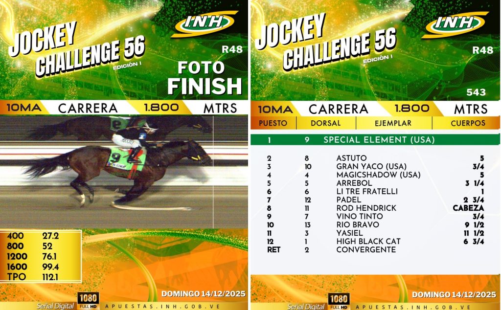 La RinconadaVenezuela SPECIAL ELEMENT muy cómodo en el Clásico Junior Alvarado diciembre 14, 2025 Juan Carlos Feijoó G. Sin enemigos, el presentado por Carlos Luís Uzcátegui se impuso con facilidad en el I Clásico Junior Alvarado (G1), dando un paso más a lo que podría ser el título de Caballo del Año en Venezuela. INFORMACIÓN EN DESARROLLO.