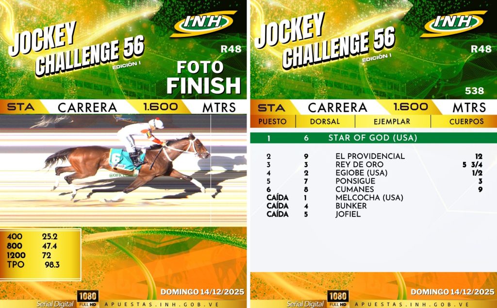 Cuando todo parecía indicar que la norteamericana MELCOCHA lograría una cómoda victoria, mediada la recta final se fracturó produciendo la caida de BUNKER y de JOFIEL, quedando STAR OF GOD adelante e imponiéndose con facilidad en el Clásico Comparación (G1).
