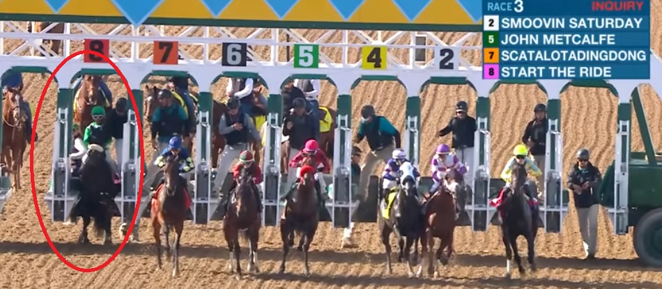Cuando fue a debutar el 16 de noviembre en Del Mar en una carrera de una milla, Start the Ride fue declarado no participante después de que el asistente del partidor mantuviera sus riendas demasiado tiempo después de que se abrieran las compuertas. Ese día, se quedó 13 cuerpos atrás en los primeros 400 metros, antes de rematar y cruzar la meta en cuarta posición. (Ver video completo)
