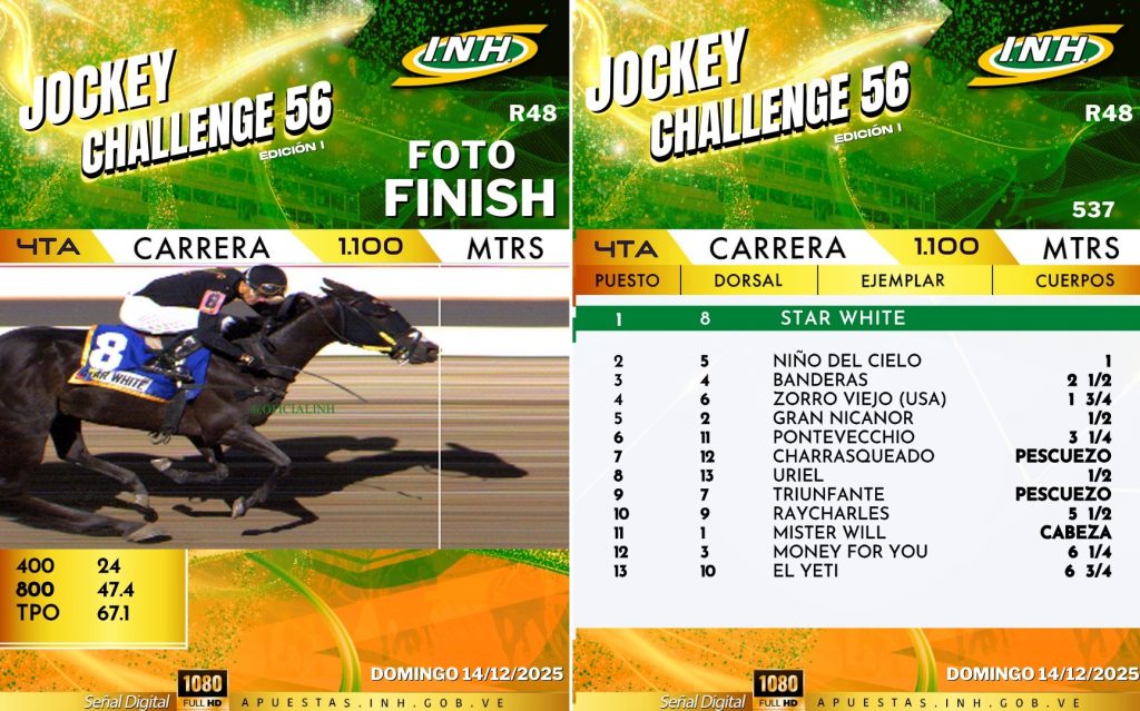 La RinconadaVenezuela STAR WHITE vuelve al crículo de ganadores en el Clásico Cañonero diciembre 14, 2025 Juan Carlos Feijoó G. La castaña crianza del Haras Alegría se impuso en el Clásico Cañonero (G1), después de tres reveses. La conducida por Francisco Quevedo llegó a cinco victorias en ocho salidas, siempre bajo el entrenamiento de Carlos Luís Uzcátegui. INFORMACIÓN EN DESARROLLO.