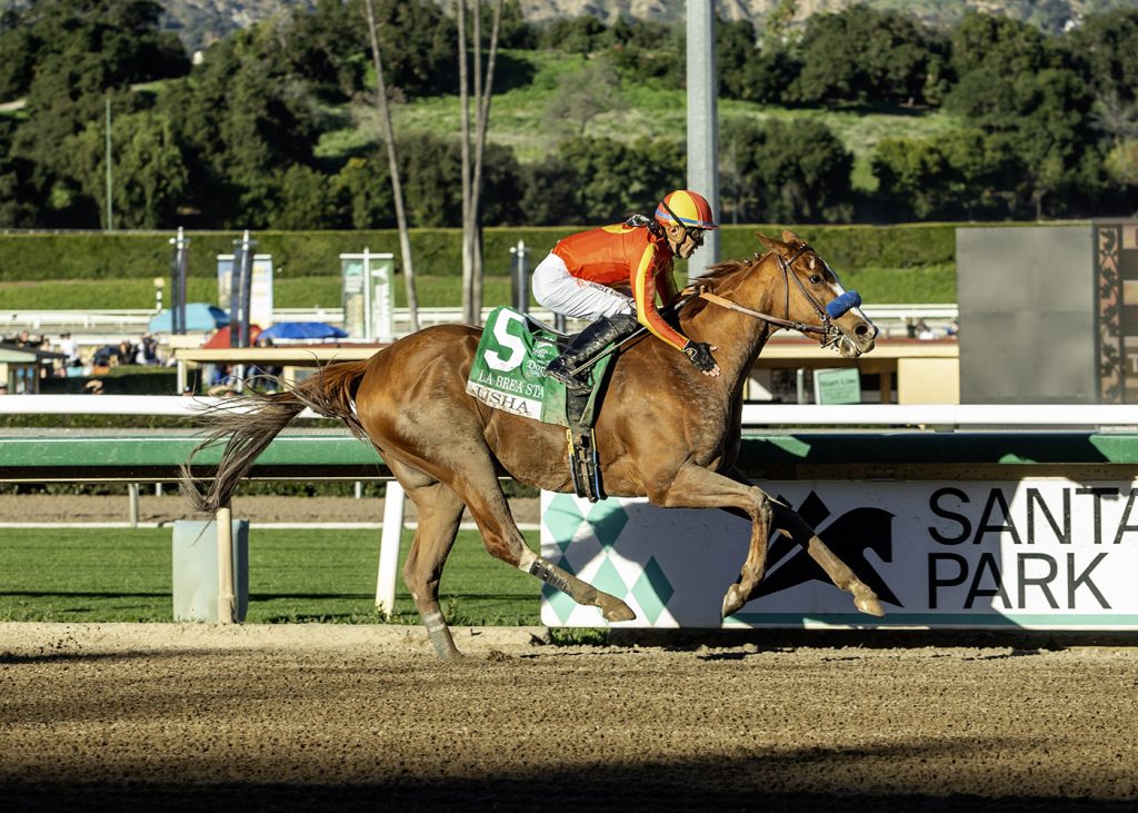 ARCADIA, California (28 de diciembre de 2025) — Usha realizó una potente actuación bajo la montura de Juan Hernández para ganar su debut en Grado I en el La Brea Stakes de 300 000 dólares del domingo para tresañeras en 1400 metros en la jornada inaugural del Classic Meet en Santa Anita Park.