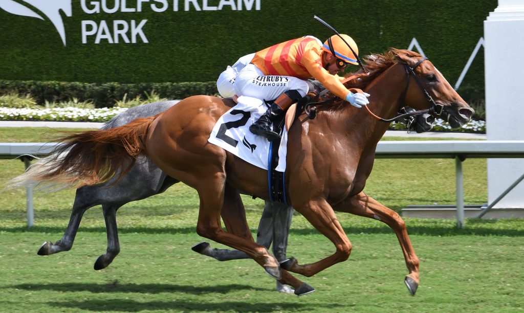 El }irlandés, entrenado por Brendan Walsh e hijo de Space Blues, quien logró su primera victoria en su cuarta carrera en 1500 metros disputada en Gulfstream en su salida anteior, se benefició de un recorrido que le permitió ahorrar terreno con Flavien Prat.